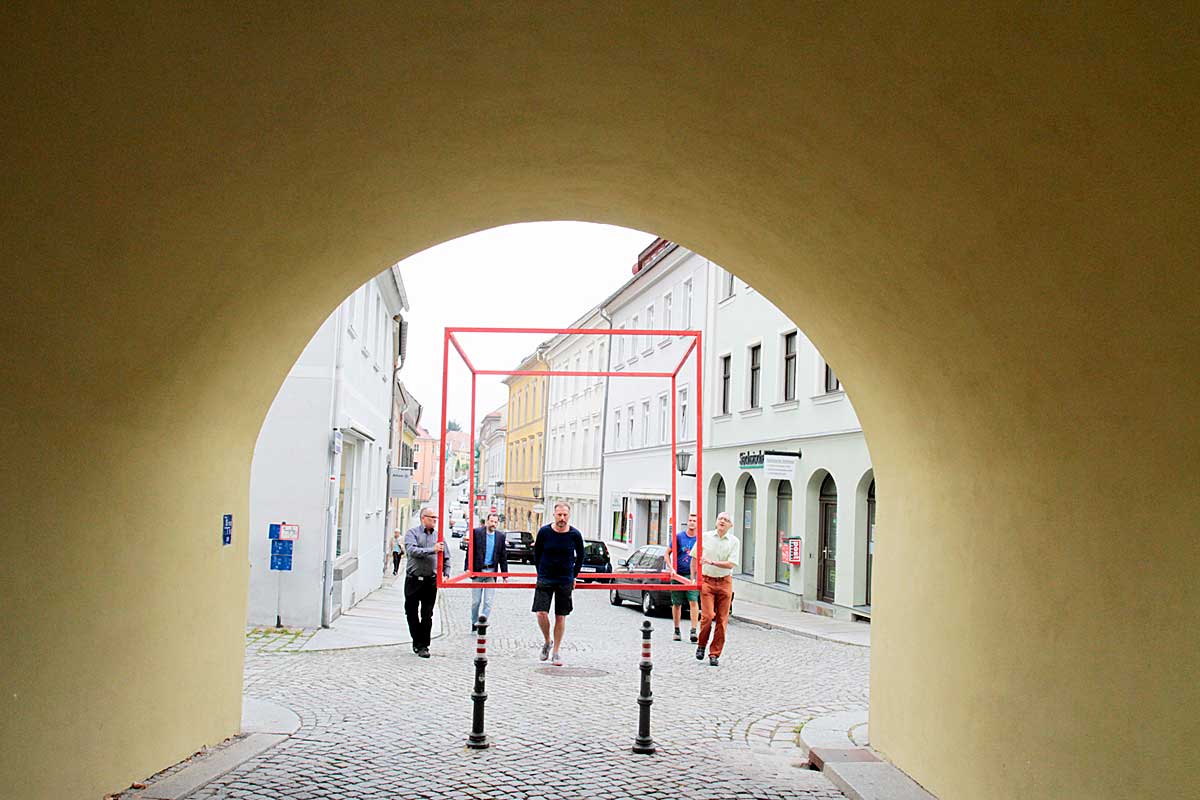 Als örtliche Einordnung des Projektes wurde bewusst das Zentrum von Kamenz gewählt, insbesondere der Markplatz selbst. Auch, weil hier das immer noch brachliegenden Potenzial sichtbar wird. Zum Beispiel im hohen Leerstand auf der Flanierebene der Geschäfte. Die beteiligten Künstler und der Verein Metamorphose sind seit vielen Jahren mit den Themen der Region vertraut, sowohl durch eigene künstlerische und ortsbezogene Arbeiten, als auch deutschlandweit durch Arbeiten und Moderation für Gruppen im Rahmen öffentlicher Projekte. Ein Ausgangspunkt war auch diesmal ein Stadtspaziergang mit Wahrnehmungswerkstatt, an dem bis zu 40 Kamenzerinnen und Kamenzer teilnahmen. Dabei wurde das große kreative Potenzial deutlich. Die Aktivitäten, die auf künstlerisch-kommunikativer Strategien beruhten, ließen langfristig wirkende Identifikationsräume für die in der Stadt lebende Gemeinschaft entstehen.